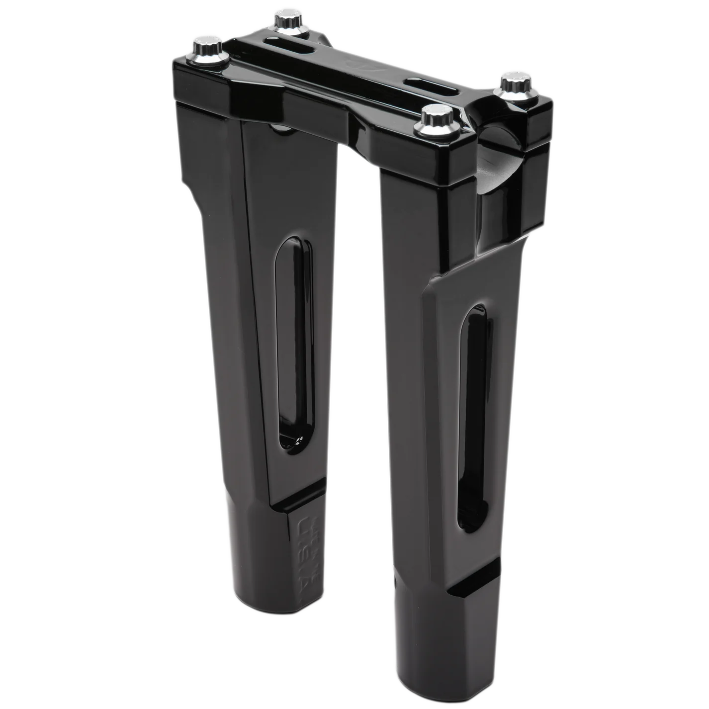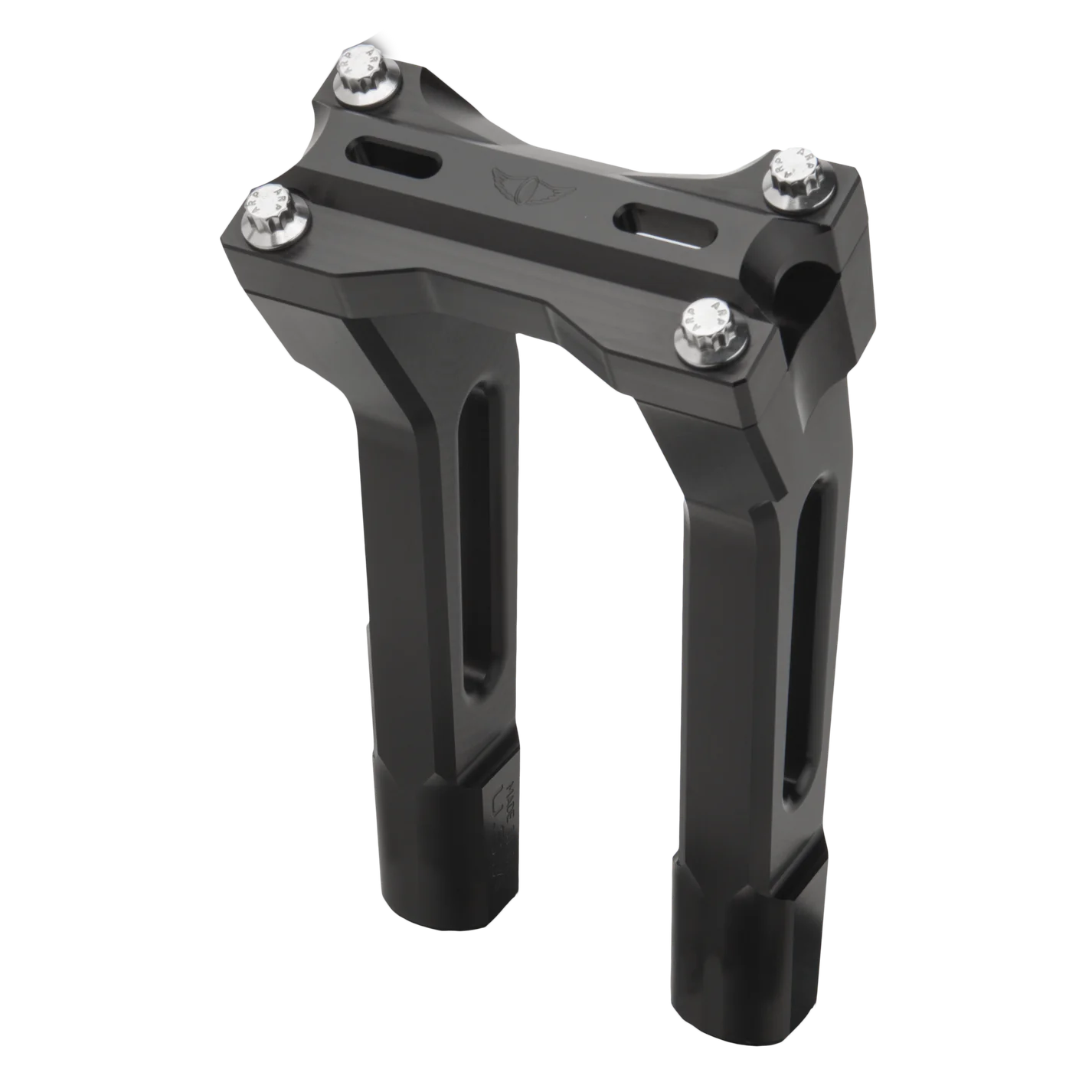 Big Al's Original design handlebar risers made from 6061 T-6 Aircraft Grade Aluminum. Made to fit 1" bars and features ARP 12pt stainless hardware. Top clamp features winged wheel logo and optional mounting kit available to fit OEM gauge mounts. 100% made in America from the raw aluminum material to the fasteners.
