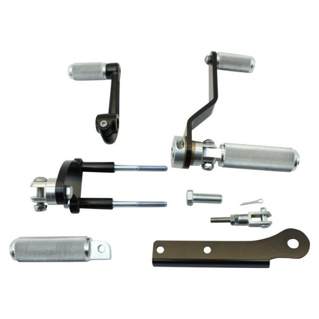 This is the same kit as our part #102-0091 mid controls, except without footpegs or toe pegs. You can use stock footpegs, or choose from a huge assortment of aftermarket pegs.