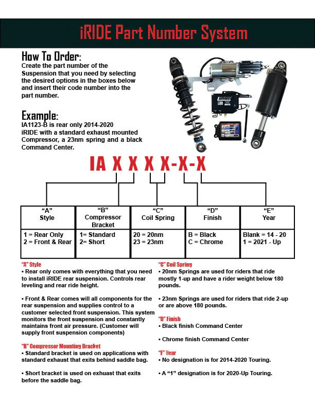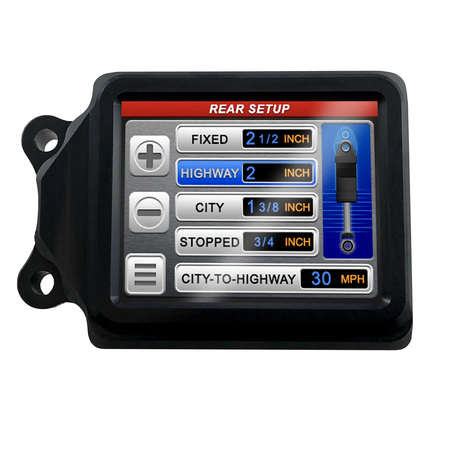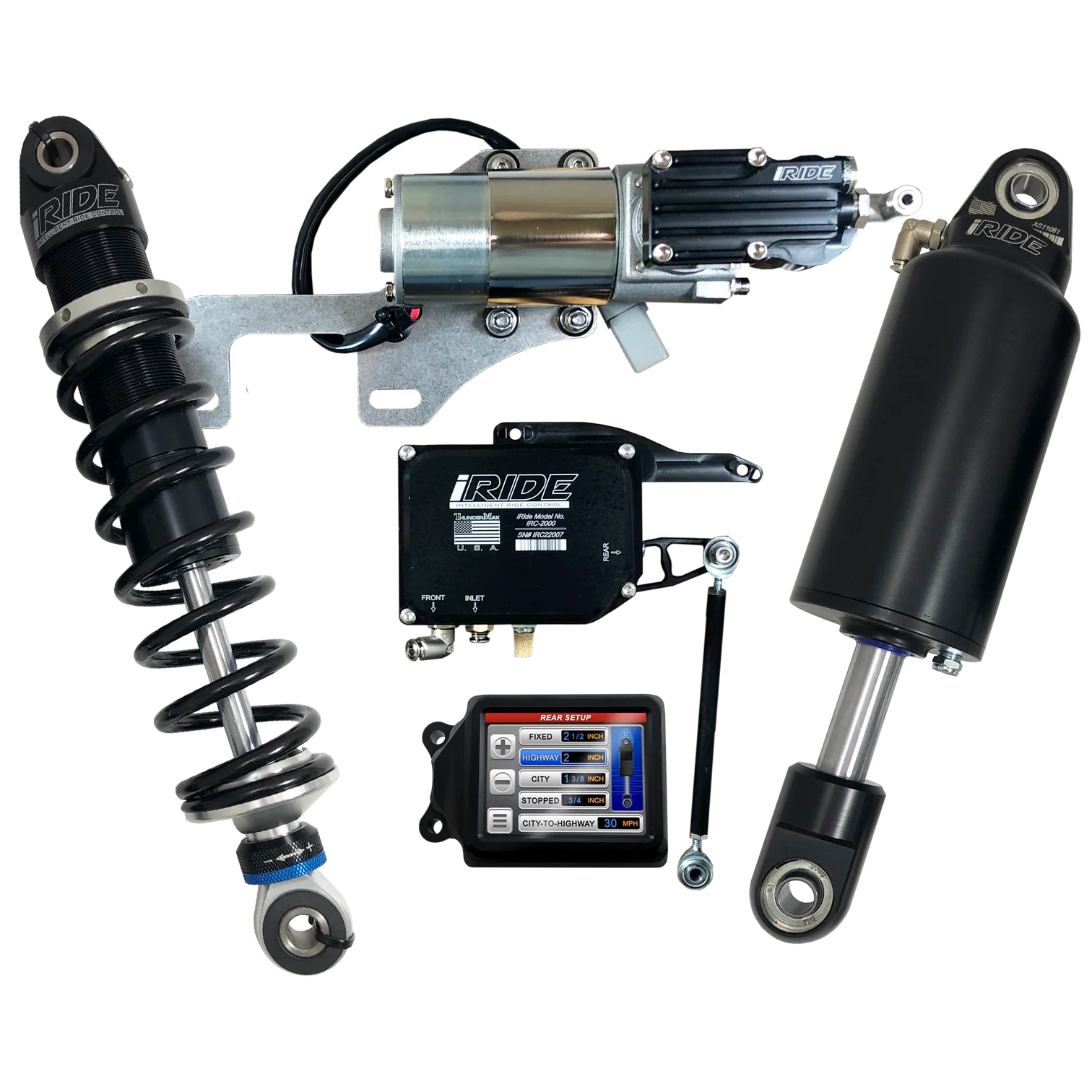 The all new iRIDE Intelligent Ride Control system is the most advanced air-assisted suspension on the market for your 2014 - 2020 Touring® motorcycle. Featuring Patent Pending technology with automatic load leveling, this means no more removing the saddle bag for manual adjustments to your suspension for riding one-up, two-up, or with luggage. The iRIDE system features a touchscreen display and gauge interface allowing full control of your motorcycle’s ride height based on vehicle speed including stopped, city, and highway modes. Combined with superior suspension cushion and dampening control, the iRIDE system was developed to provide the absolute BEST RIDE IMAGINABLE!