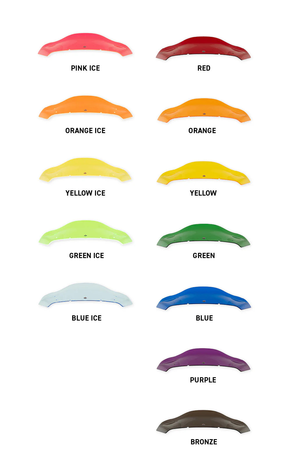 The Kolored Flare™ Windshields are crafted from high-quality acrylic and available in a wide range of striking colors, including Red, Orange, Yellow, Green, Blue, Purple, and Bronze. These windshields provide a distinctive appearance, making your motorcycle truly one-of-a-kind.