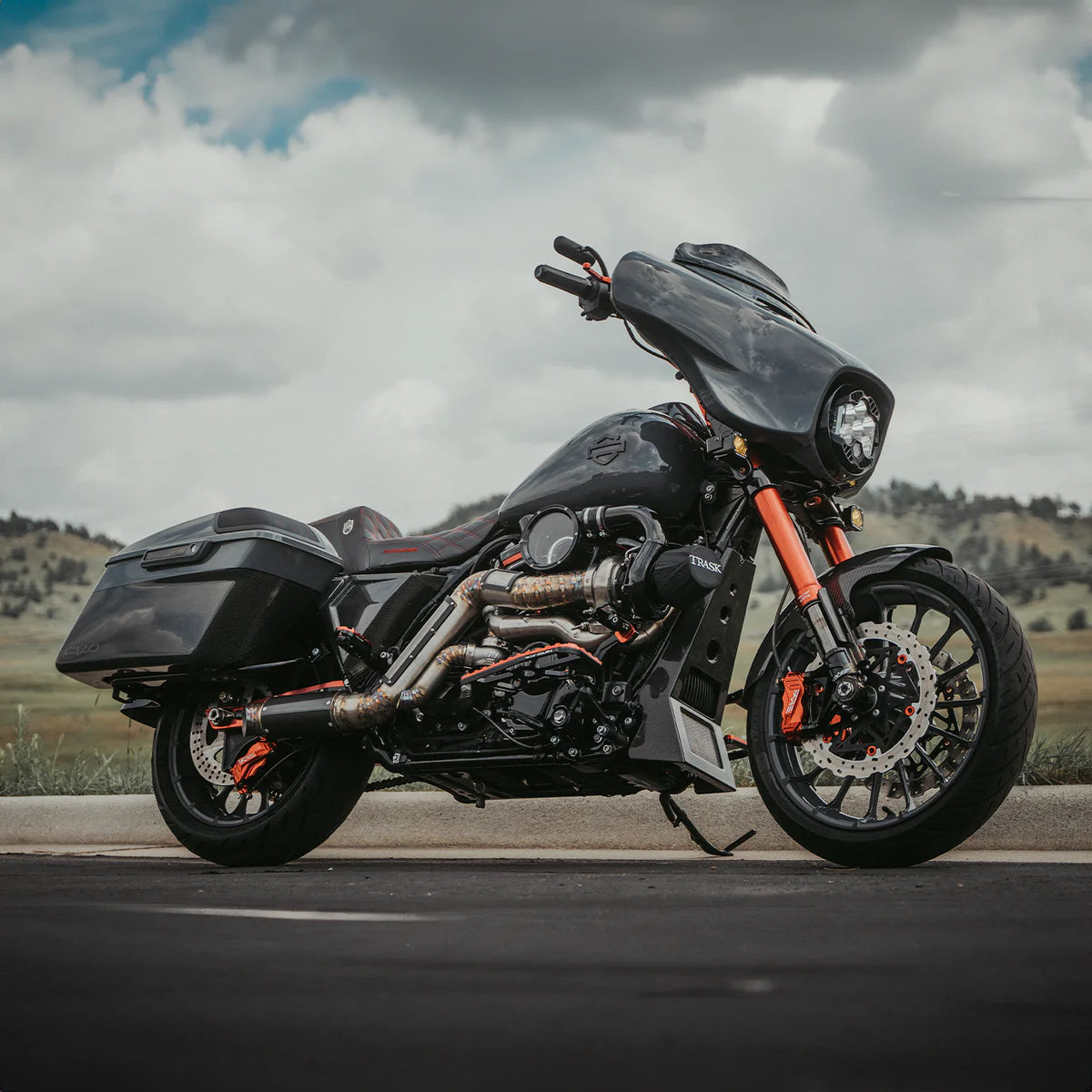 If you are looking for the epitome of performance and style, TRASK has you covered with the Assassin Turbo Kit!  This kit features a V-Band exhaust housing with a 3” discharge pipe constructed out of pie cut stainless steel for a unique custom look, while offering unmatched performance for even the largest displacement M8 motor builds.  This kit was introduced as the signature kit on our Assault Glide performance bagger builds.  Due to popular demand, it is now our best selling Stage 2 kit with some of the most powerful M8 street bikes on the road sporting it.